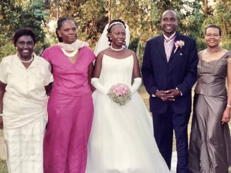 Memory Lane at Martin and Betty Owiny's wedding Day on 14 February 2004 - Left to Right Auntie Cissy, Mrs Christine Nabetta Wolukau Wanambwa, Betty Owiny, Martin Owiny, Reverend Margaret Sentamu wife to the Former Archibishop of York Rev Dr John Sentamu