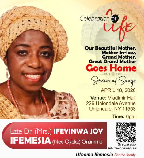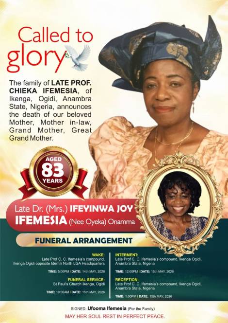 It is with profound sadness that we announce the passing of our mother, Dr. (Mrs.) Ifeyinwa Joy Ifemesia (née Oyeka),