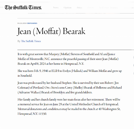 Jean (Moffat) Bearak passed on April 6, 2024 at her home in Hempstead, N.Y. in the loving company of her sister Marjory (Moffat) Stevens of Southold and son Robert of Portland, Oregon. Jean was predeceased by her husband Stephen. In addition to Marjory and Robert she is survived by Al and Janice Moffat of Mooresville, N.C.; Steve’s sons Corey (Rachelle) Bearak of Bellerose and Richard (Adrianne Wallace) Bearak of Brooklyn; and her grandchildren.