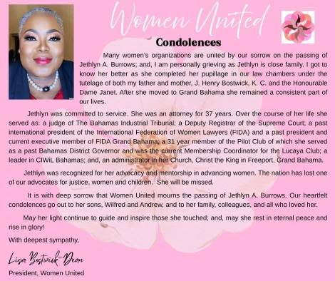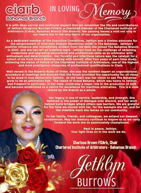 After retiring from the judiciary in 2011, Jethlyn reentered private practice, first as a Partner at Meridian Law Chambers, and later as Managing Partner of her own firm, Musgrove Burrows Law Chambers, founded in 2016. Through her firm, she provided counsel in Employment Law, Family Law, Real Estate, Criminal, and Civil matters. She was a sought-after advisor, mentor, and teacher to many young lawyers across Grand Bahama and The Bahamas. Jethlyn believed deeply in preparing the next generation of attorneys to serve with integrity and humanity. She trained the junior lawyers thoroughly and expected excellence, but always with kindness and humor.