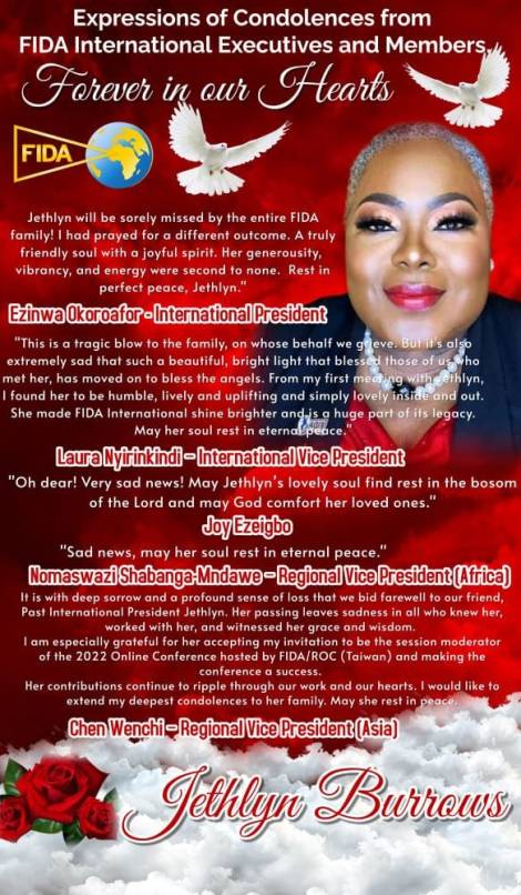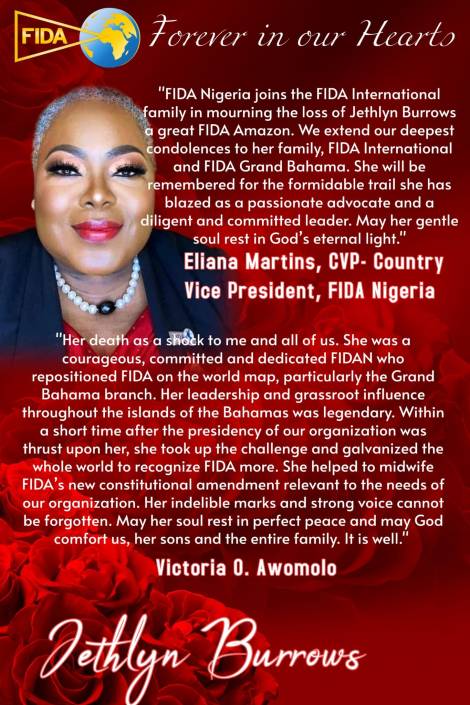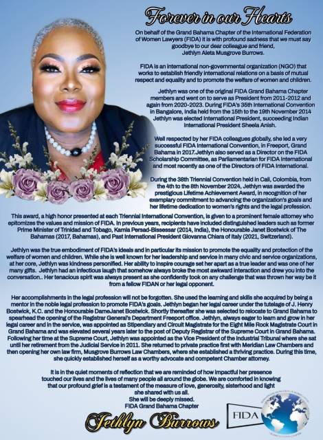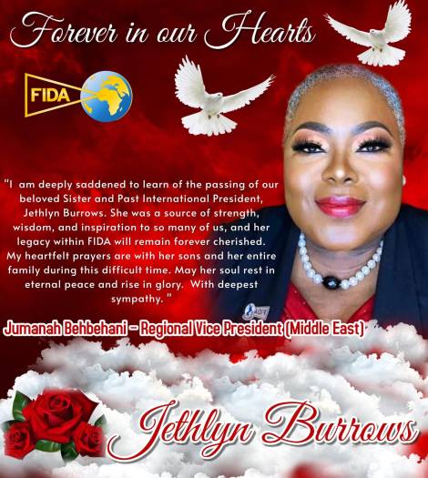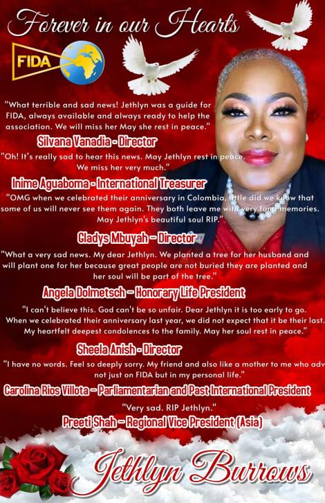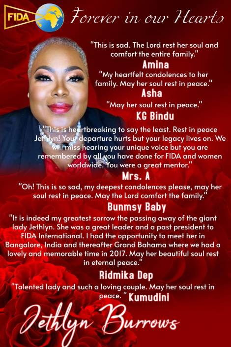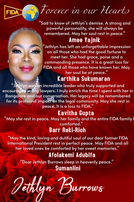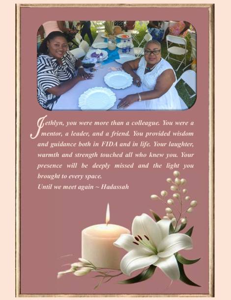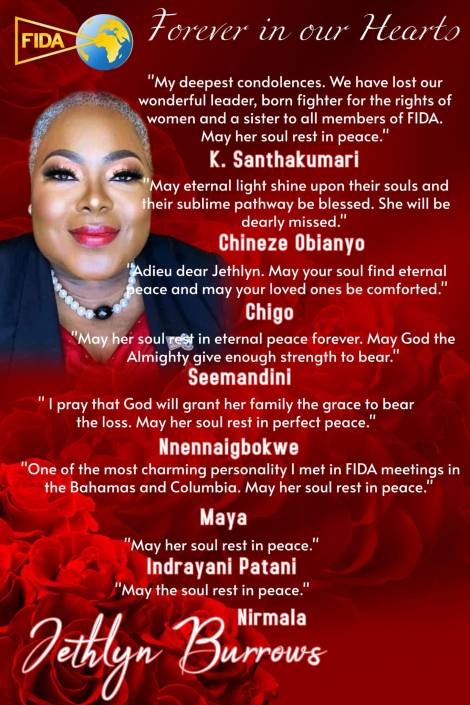 Jethlyn was a phenomenal woman, a beacon of light. Her warmth, laughter, and generosity touched lives across the globe. Across the FIDA Community worldwide and beyond, her absence is deeply felt, and the grief is profound, as her impact was extraordinary. She was deeply committed to everything she believed in and gave of herself fully. Her passion for justice and service was unmatched. Jethlyn lived a full and accomplished life, and her legacy will continue to inspire. Her work and spirit remain etched in the hearts of those she served and loved.
