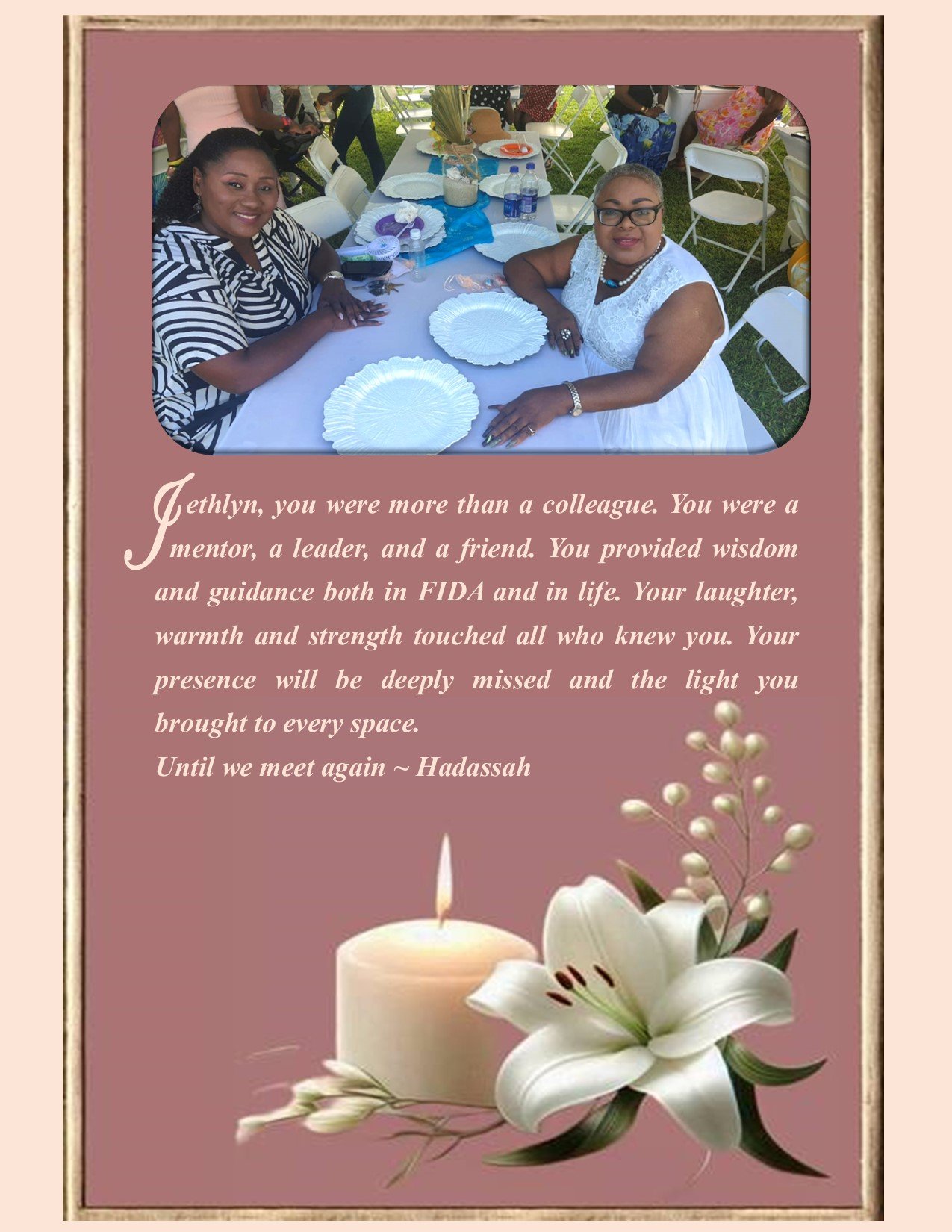 I am deeply grateful to God for the gift of Jethlyn’s loyal and enduring friendship. Her presence enriched my life, and she will be profoundly missed.