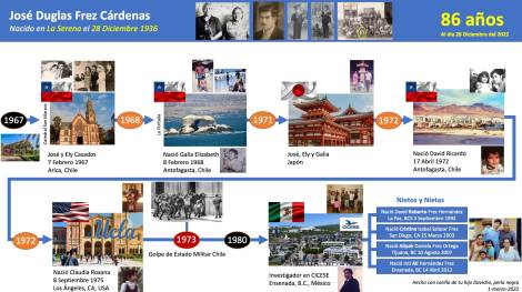 El 23 de junio del 2025 falleció en paz nuestro querido padre José Duglas Frez Cárdenas, a la edad de 88 años. Nuestro padre fue un esposo devoto de su amada esposa Elizabeth Puente Herrera, con quien compartió una maravillosa relación matrimonial durante 45 años, comenzando desde Chile, viajando a Japón, USA y donde finalmente se establecieron en México, donde ambos partieron y están juntos ahora para el descanso eterno en paz. Nuestro padre dejó huella con recuerdos imborrables con sus tres hijos Galia Elizabeth, David Ricardo y Claudia Roxanna.