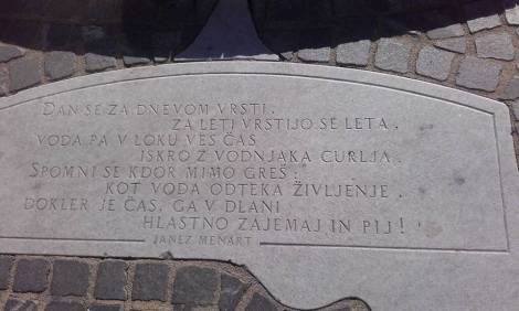 Dan se za dnem vrsti, za leti vrstijo se leta, voda pa v loku ves čas iskro z vodnjaka melje: Spomni se, kdor mimo greš, kot voda odteka življenje, dokler je čas, ga v dlani hlastno zajemaj in pij. - Janez Menart