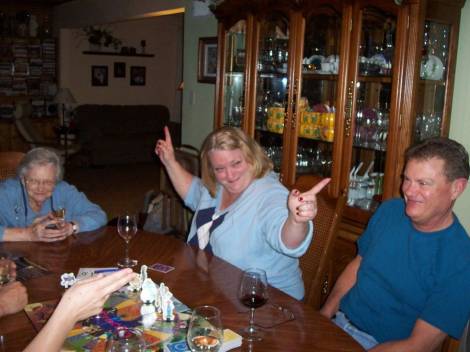 We made mountains of memories at family gatherings. On Christmas Eve 2011, some of the local members of the family gathered at my parents' house in Cherry Valley. We ate a hearty meal, raised a glass, and spent some time together. We played a silly board game. We had simple fun. We joked and laughed, and Kathy pretended to be guiding air traffic when the game called for it. I found a rare pic of her during that Christmas Eve game and was delighted to have a precious, clumsy record of the moment. I wish I could bottle the feeling of family that was baked into that memory and share it with you.