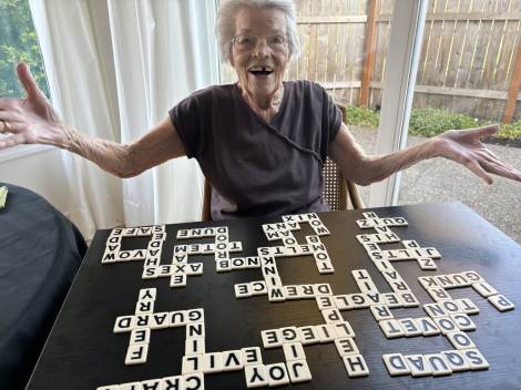 Olive nurtured four great loves with pride and joy over her long, rich life: Love of Family (the Pitkin and Hulett clans from which she sprang, and whose values of hard work, grit, responsible citizenship, kinship with the land, intellectual curiosity and artistic expression she passed on to her descendants—her husband—her children and their families); Love of Words (voracious and eclectic reading—merciless Scrabble playing— endless crossword puzzles—long letters, sometimes laid out as newspaper articles, with hilarious tales of everyday events reported with great wit—the family tradition of writing a poem, the longer, more ornate and zanier the better, to accompany each gift at Christmas); Love of Classical Music (Mozart and Bach most all of all—singing, playing piano and violin— ardent patronage of the opera, the ballet, and choral and chamber music); and Love of the Domestic Arts (astonishing skill, creativity, and productivity in sewing, knitting, embroidery, furniture refinishing, cooking, and gardening).