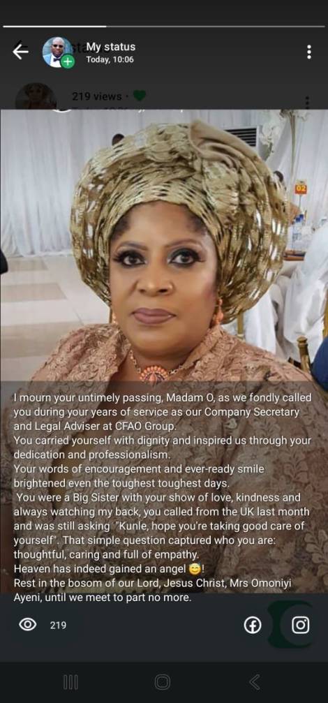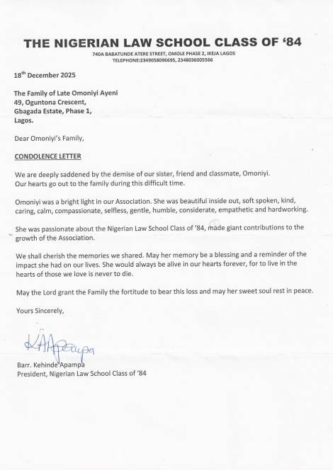 Adieu, Omoniyi Bridget Ayeni! May your gentle soul rest in peace. May the Almighty God grant your immediate family, relatives, your NLS '84 siblings, friends, loved ones, and well-wishers the fortitude to bear this irreparable, untimely, and painful loss.